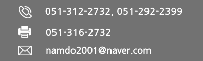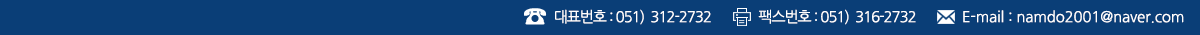 본사(1공장) : 부산광역시 강서구 신호산단3로87번길 24(신호동) 우편번호(46759) 대표전화 : 051-312-2732 Ι 팩스 : 051-316-2732 Ι E-mail : namdo2001@naver.com 2공장 : 부산광역시 강서구 과학산단1로 25(지사동) Ι 전화번호 : 051-941-2733